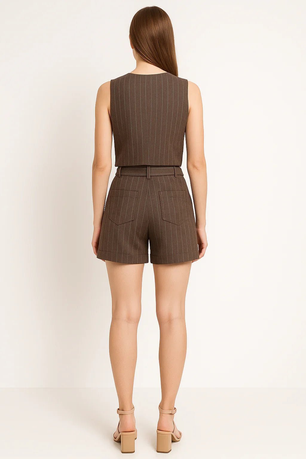 Conjunto feminino KLEPTON marrom em alfaiataria listrada, composto por colete sem mangas com botões frontais e short de cintura alta com cinto ajustável. Sofisticado e moderno, é ideal para ocasiões formais ou casuais, garantindo conforto, caimento impecável e elegância em cada detalhe.