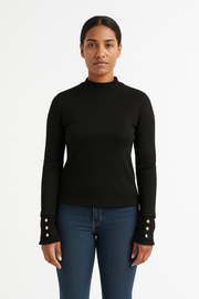 Blusa canelada preta feminina de manga longa, com gola alta clássica e punhos decorados por botões dourados. Versátil e elegante, combina conforto e sofisticação, ideal para compor looks casuais ou formais em todas as estações do ano.