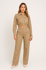 Conjunto moderno composto por cropped estilo camisa de manga longa com bolsos frontais e detalhe em argolas, combinado à calça cargo com bolsos utilitários e modelagem reta. Versátil e atual, pode ser usado junto ou separado, criando looks casuais ou sofisticados com muito estilo.