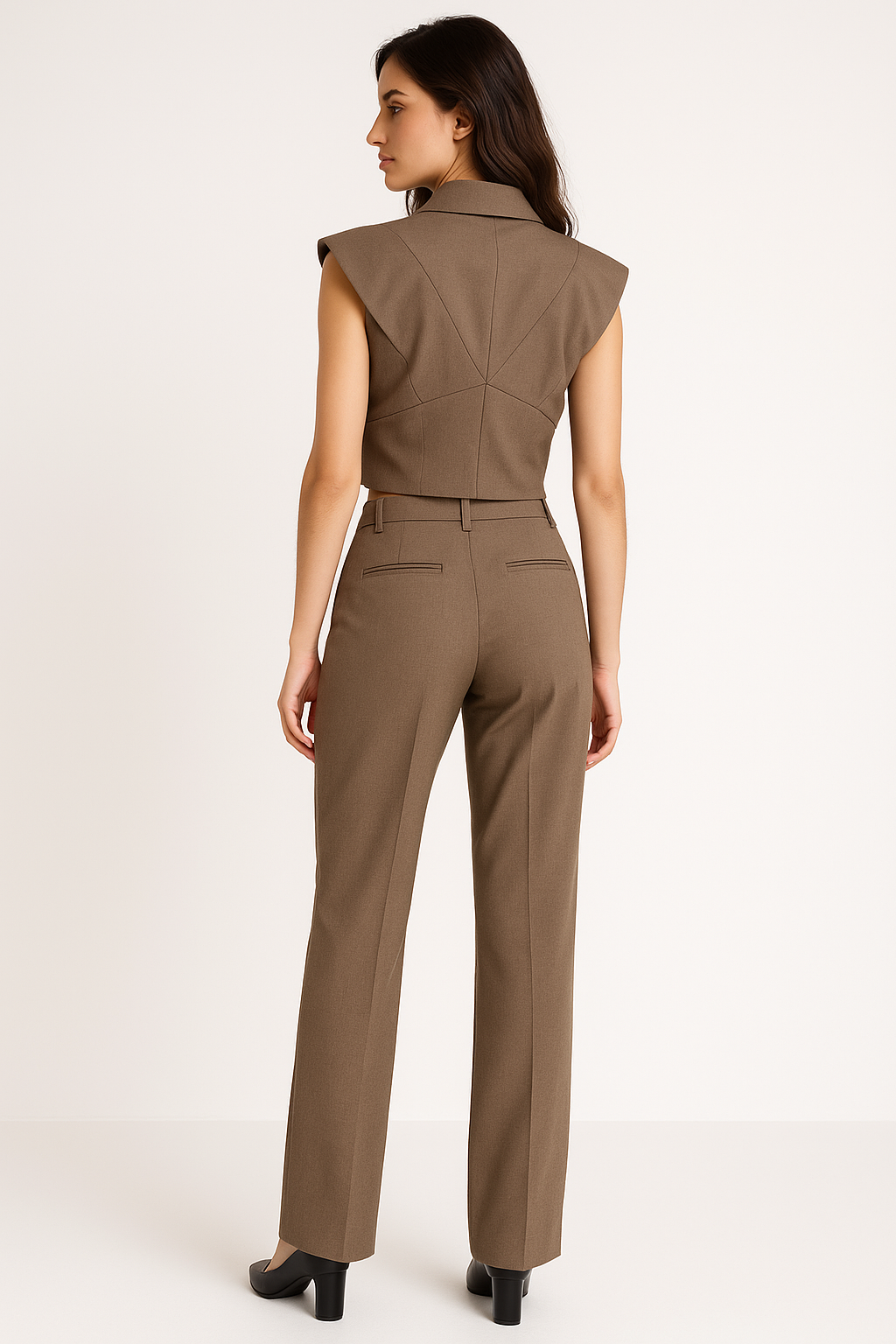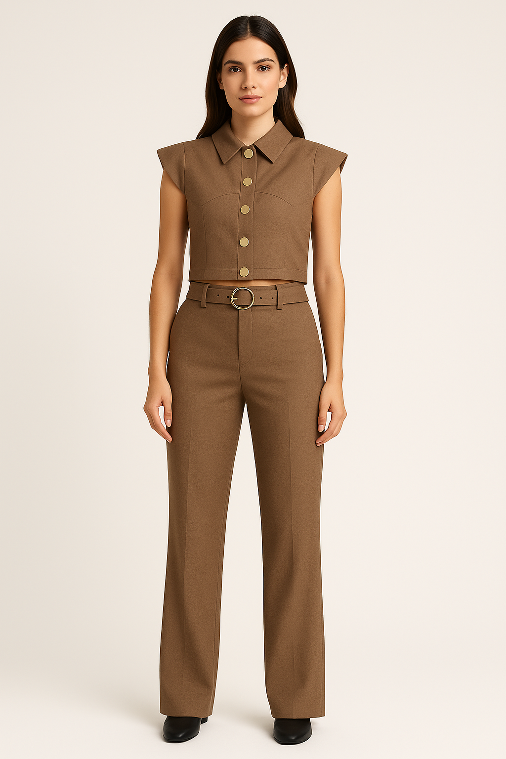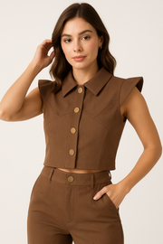 Cropped feminino Klepton estruturado, modelagem ajustada, gola clássica e fechamento frontal com botões. Um design moderno e elegante, ideal para combinações com calças, saias ou shorts em looks sofisticados e atuais.