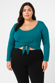 Cropped plus size manga longa em tecido com elastano, oferecendo conforto e caimento ajustado. Modelo com decote redondo e amarração frontal, que valoriza a cintura com charme moderno. Uma peça versátil e estilosa para compor produções casuais ou sofisticadas com praticidade.