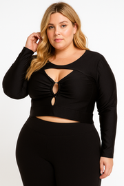 Cropped plus size preto confeccionado em tecido com elastano, mangas longas e decote redondo. O recorte frontal com detalhe franzido e argola valoriza o busto e adiciona charme moderno. Uma peça sofisticada e versátil para compor looks casuais ou elegantes com estilo.