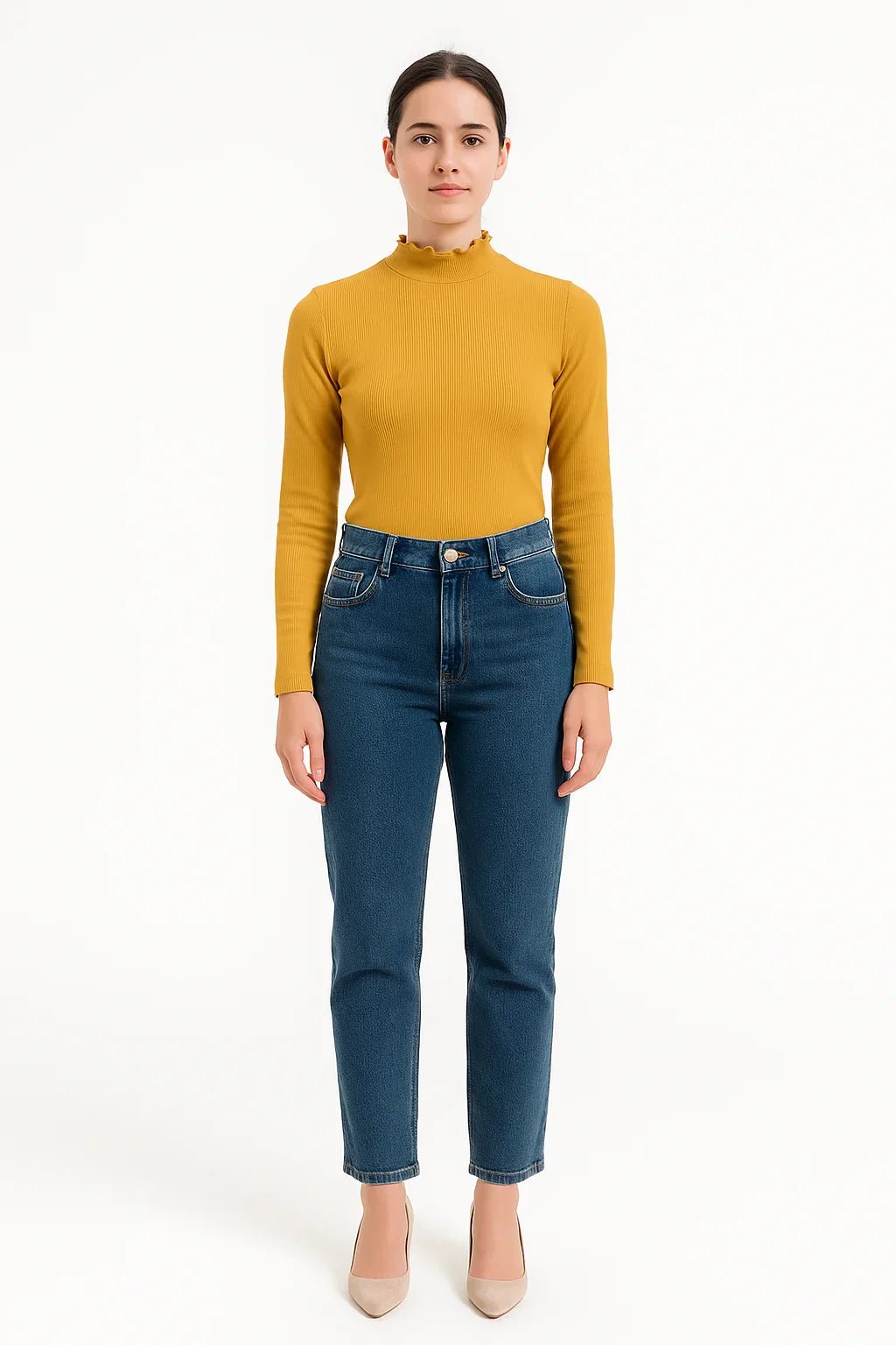 Blusa K2B feminina de manga longa com gola alta adornada por detalhe em babado. Confeccionada em modelagem canelada ajustada ao corpo, combina elegância e conforto. Ideal para looks casuais ou sofisticados,