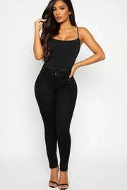 Calça skinny feminina Empório Pit Bull preta, confeccionada em tecido jeans com elastano que valoriza as curvas e garante conforto. Possui cós personalizado com aplicação da marca em strass, fechamento por zíper e botão metálico. Modelo versátil para composições casuais ou sofisticadas.