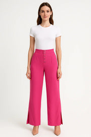 Calça Pantalona Feminina Rosa com Botões Frontais e Fenda Lateral