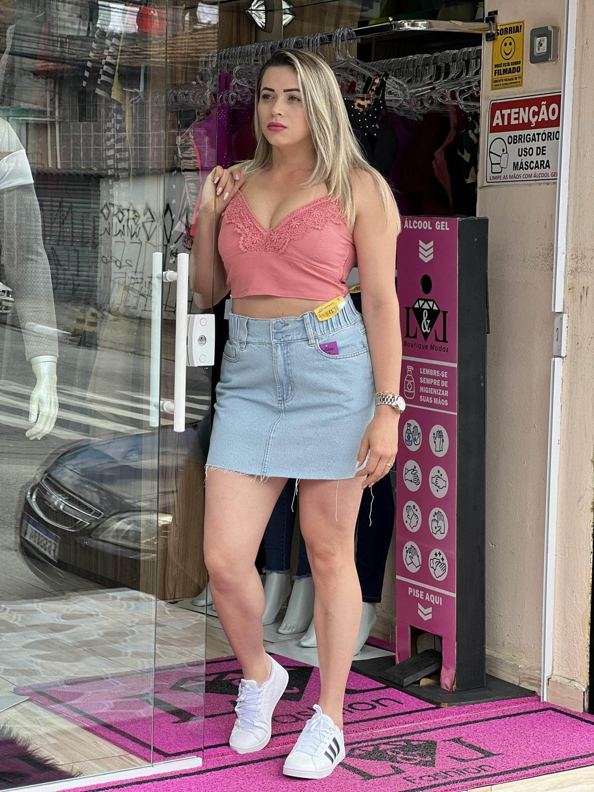 Saia jeans feminina, lavagem clara leve, modelagem reta com cintura alta. Barra desfiada com fenda lateral, recorte e bolsos funcionais. Fechamento por zíper e botão. Versátil para o dia a dia, combina com tops, camisas e jaquetas. Marca a confirmar; peça moderna. Ideal para estações e viagens.