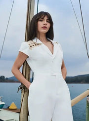 Macacão Tufi Duek em branco, modelagem de alfaiataria, com gola lapela e fechamento frontal. Destaque para os ombros com detalhe vazado e aplicações que agregam sofisticação. Perfeito para eventos formais, jantares e ocasiões que pedem um look refinado e imponente.