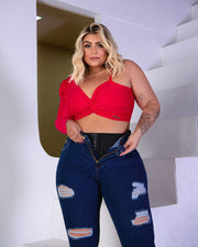 Cropped plus size vermelho com design assimétrico, manga única longa e decote em V com detalhe torcido. A modelagem justa valoriza o corpo e garante estilo em produções modernas e ousadas. Uma peça versátil para compor looks casuais ou sofisticados com muito charme.
