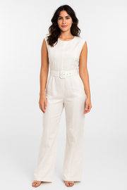 Macacão feminino Klepton branco em alfaiataria, sem mangas, modelagem reta e detalhe de cinto no mesmo tecido com fivela forrada. Sofisticado e elegante, é ideal para ocasiões especiais ou produções profissionais, garantindo conforto, estilo refinado e versatilidade ao visual feminino.